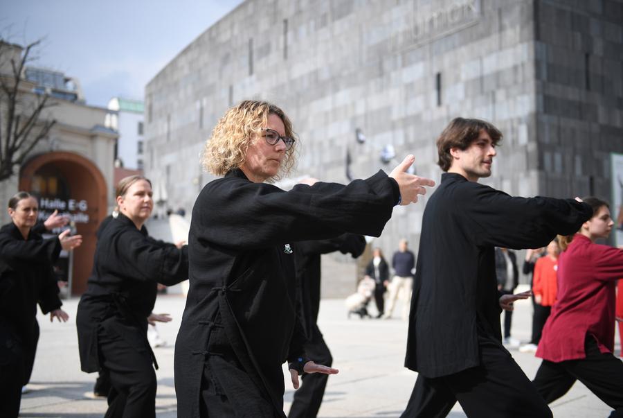 Enthusiasts perform Taijiquan, a kind of Chinese traditional martial arts, in Vienna, Austria, March 21, 2026. A celebration of the first International Taijiquan Day was held here on Saturday. (Xinhua/He Canling)