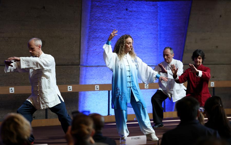 Taijiquan practitioners perform during the celebration event in Paris, France, on March 18, 2026. A celebration ahead of the first International Day of Taijiquan, to be observed on March 21, was held on Wednesday at the United Nations Educational, Scientific and Cultural Organization (UNESCO) headquarters in Paris under the theme "Fit for Life, Go for Taiji." (Xinhua/Wu Huiwo)