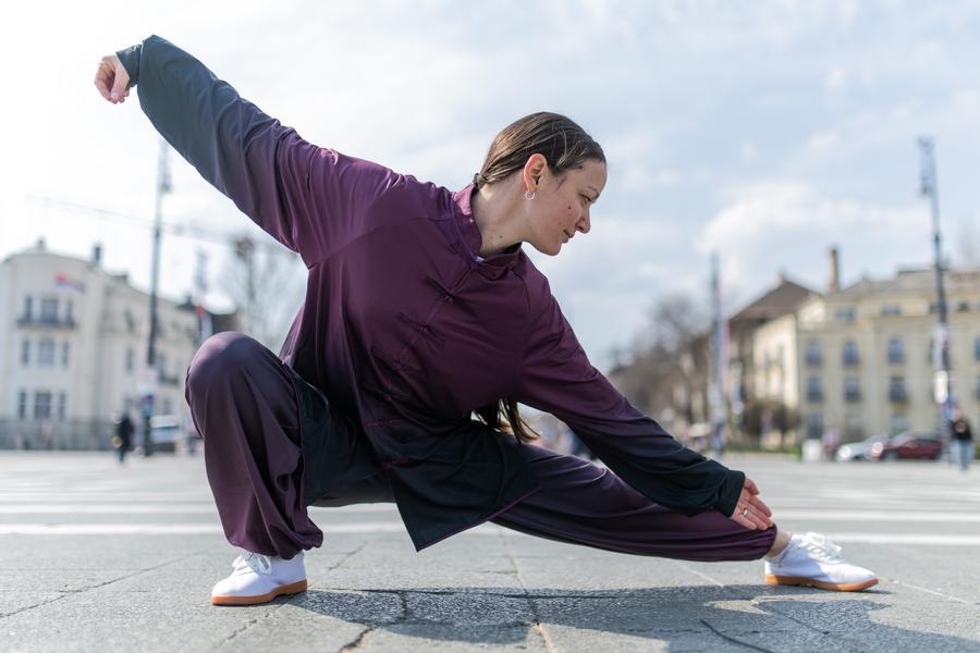 Alexandra Rudolf, a Taijiquan enthusiast, poses for a photo during the celebration event in Budapest, Hungary, on March 21, 2026. A celebration of the first International Day of Taijiquan, organized by the Hungarian Wushu Federation, was held here on Saturday at Heroes' Square. (Photo by Marton Koncz/Xinhua)