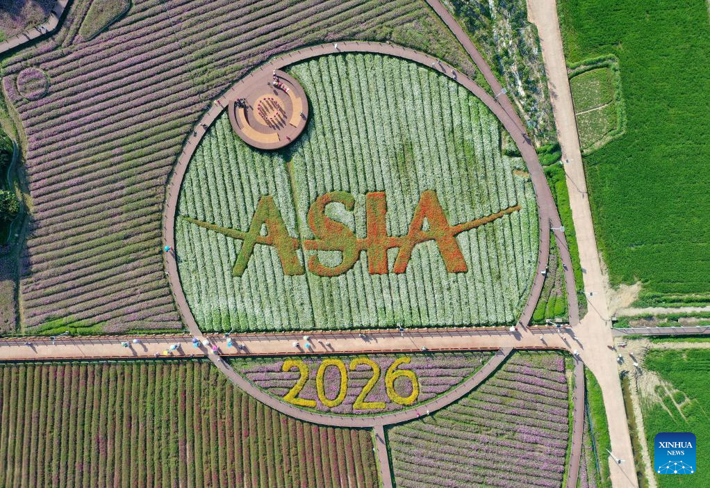 An aerial drone photo shows flower fields at Nanqiang Village in Boao Town, Qionghai City, south China's Hainan Province, March 17, 2026. The Boao Forum for Asia has been empowering the city's overall development for 25 years since its inception in 2001. (Xinhua/Guo Cheng)