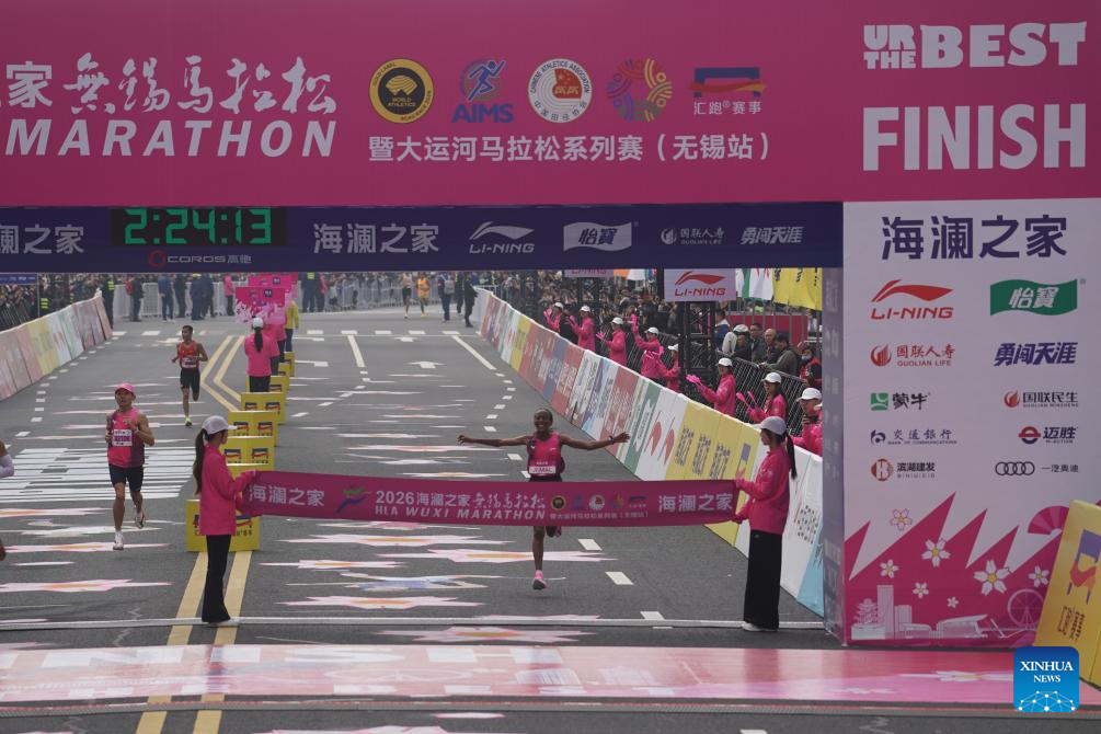 Amid Fozya Jemal of Ethiopia crosses the finishing line during the Wuxi Marathon 2026 in Wuxi, east China's Jiangsu Province, March 22, 2026. (Photo by Liu Zhenrui/Xinhua)