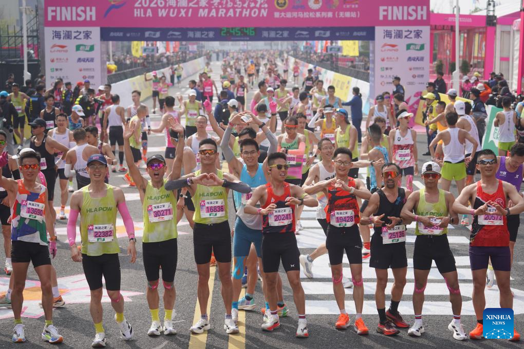 Participants pose after crossing the finishing line during the Wuxi Marathon 2026 in Wuxi, east China's Jiangsu Province, March 22, 2026. (Photo by Liu Zhenrui/Xinhua)