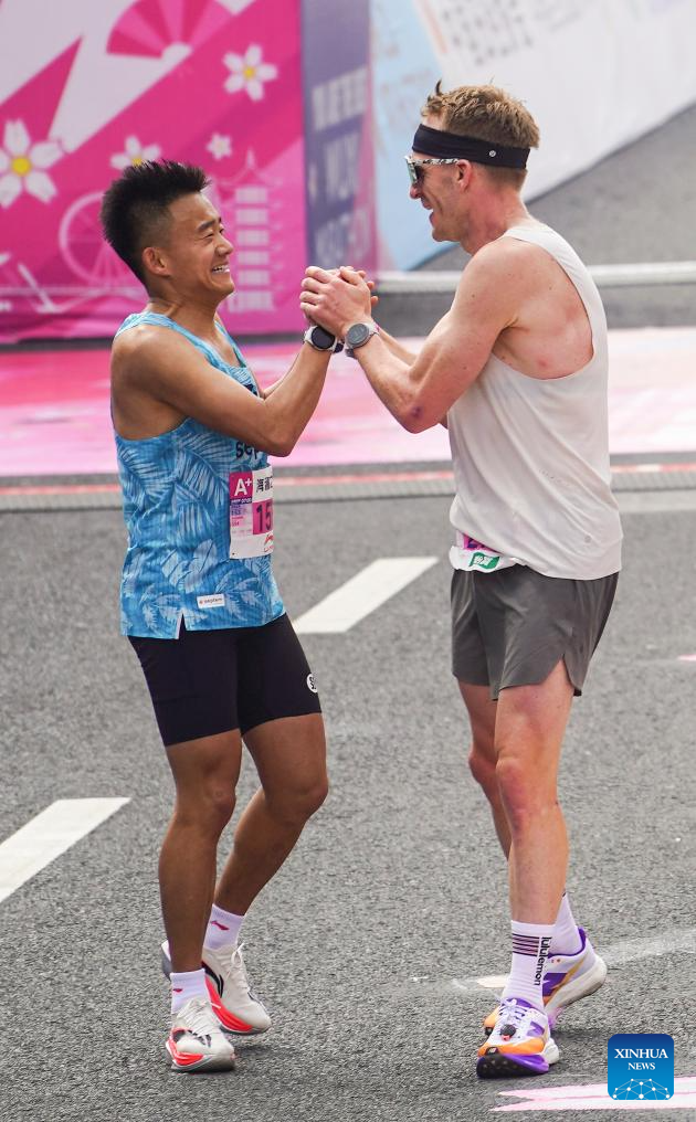 Two participants shake hands after crossing the finishing line during the Wuxi Marathon 2026 in Wuxi, east China's Jiangsu Province, March 22, 2026. (Photo by Liu Zhenrui/Xinhua)