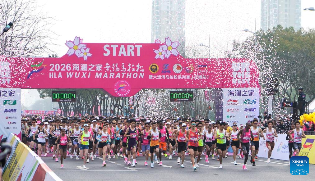 Participants start during the Wuxi Marathon 2026 in Wuxi, east China's Jiangsu Province, March 22, 2026. (Photo by Liu Zhenrui/Xinhua)