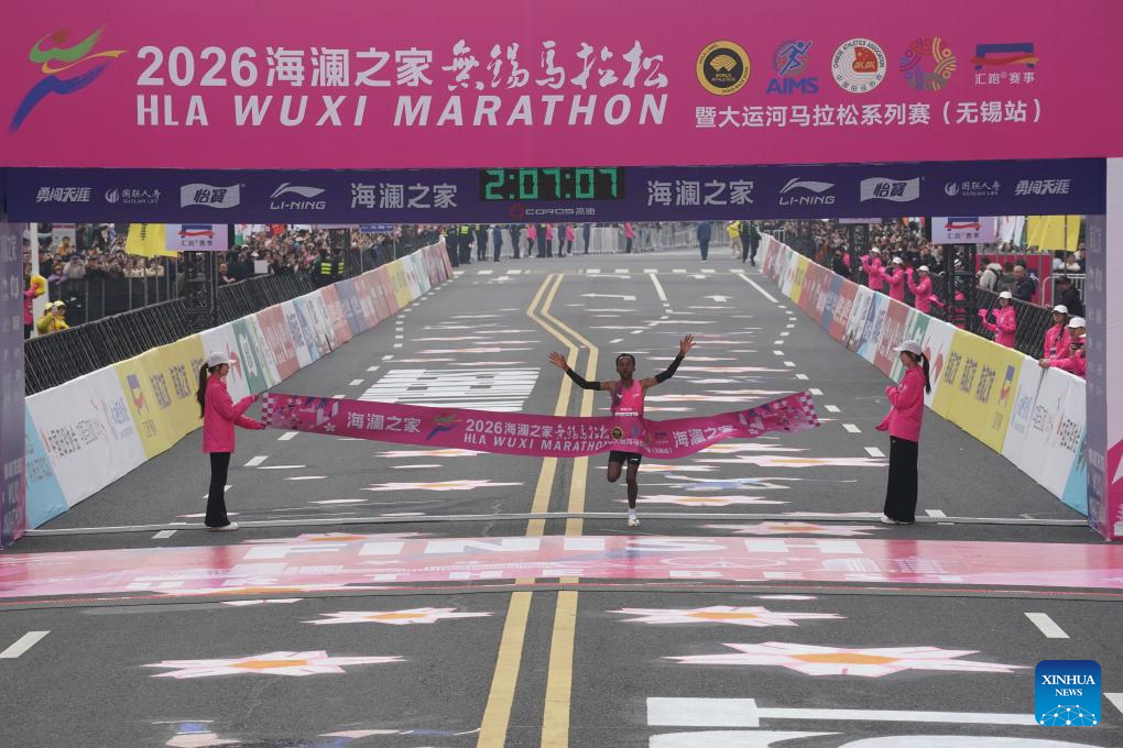 Kemal Husen of Ethiopia crosses the finishing line during the Wuxi Marathon 2026 in Wuxi, east China's Jiangsu Province, March 22, 2026. (Photo by Liu Zhenrui/Xinhua)