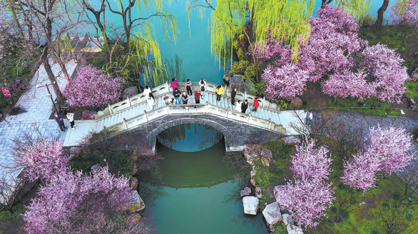 Tourists view the spring scenery at the Slender West Lake scenic spot in Yangzhou, Jiangsu province, on Friday, the day of Spring Equinox — when day and night are nearly equal in length and spring is in full bloom. QI LIGUANG/XINHUA