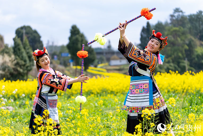 Young women in traditional costumes of the Miao ethnic group dance amid rapeseed flowers in Wanggang village, Xinpu Bouyei ethnic township, Wudang district, Guiyang, southwest China's Guizhou Province. (People's Daily Online/Tu Min)