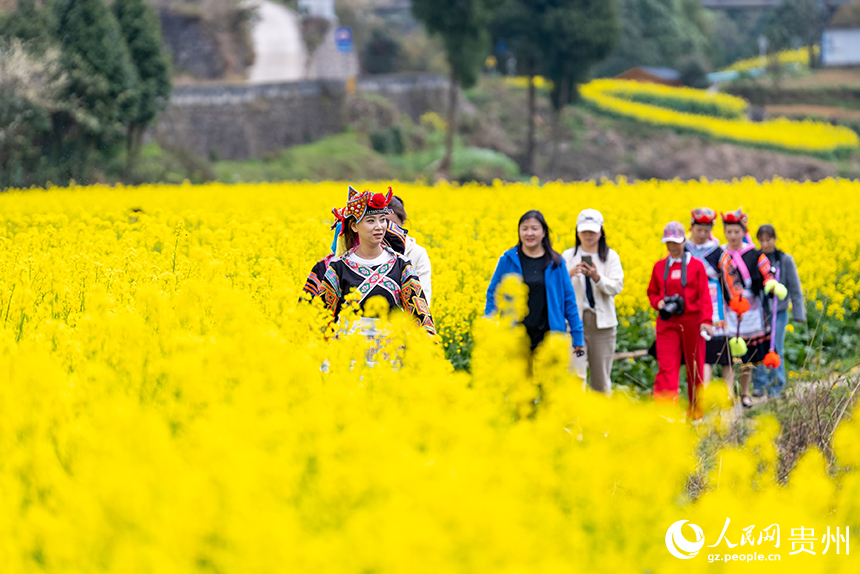 Visitors enjoy blooming rapeseed flowers in Wanggang village, Xinpu Bouyei ethnic township, Wudang district, Guiyang, southwest China's Guizhou Province. (People's Daily Online/Tu Min)