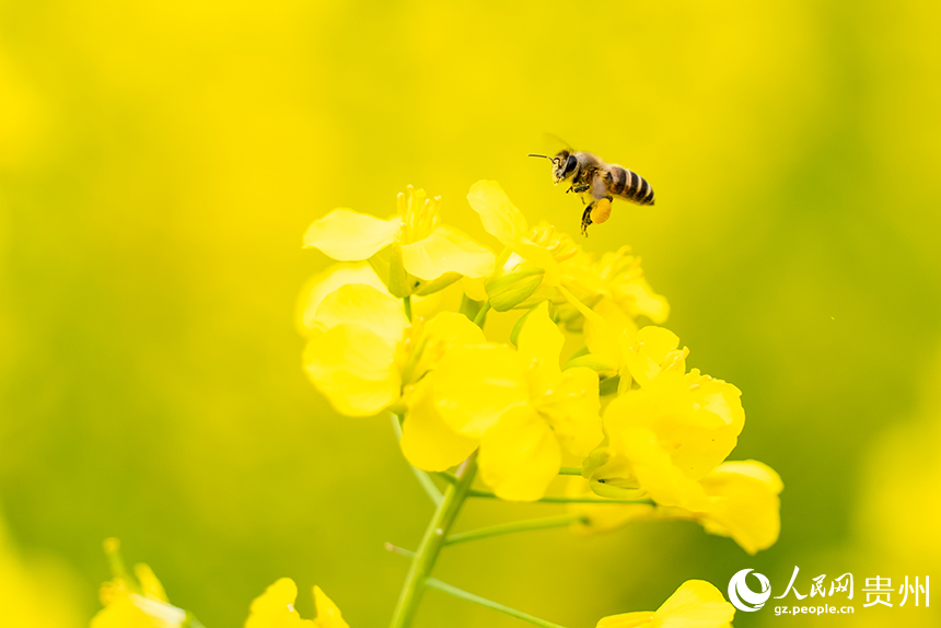 A bee collects nectar from a rapeseed flower in Xinpu Bouyei ethnic township, Wudang district, Guiyang, southwest China's Guizhou Province. (People's Daily Online/Tu Min)