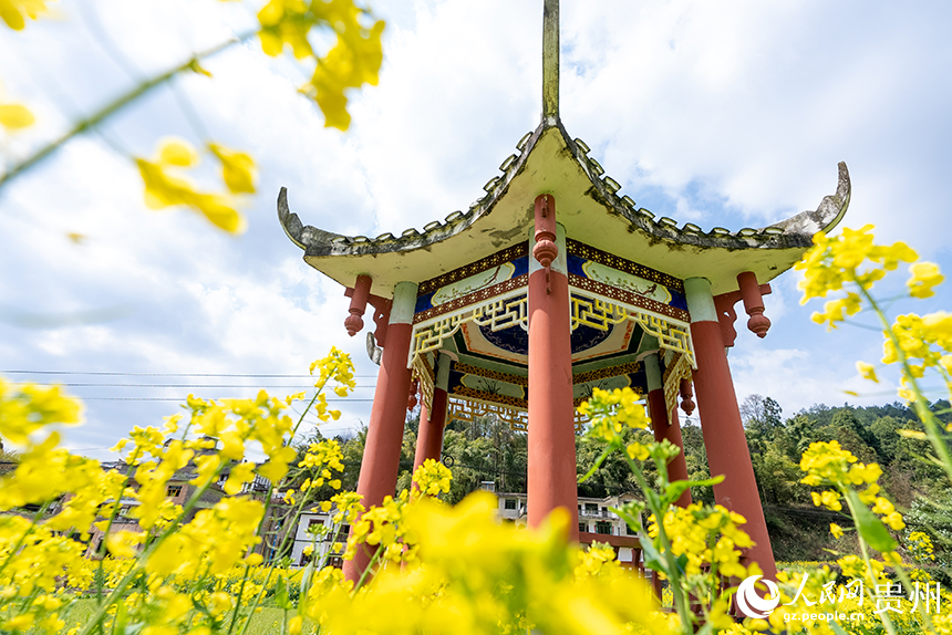 Photo shows blooming rapeseed flowers and a pavilion in Wanggang village, Xinpu Bouyei ethnic township, Wudang district, Guiyang, southwest China's Guizhou Province. (People's Daily Online/Tu Min)