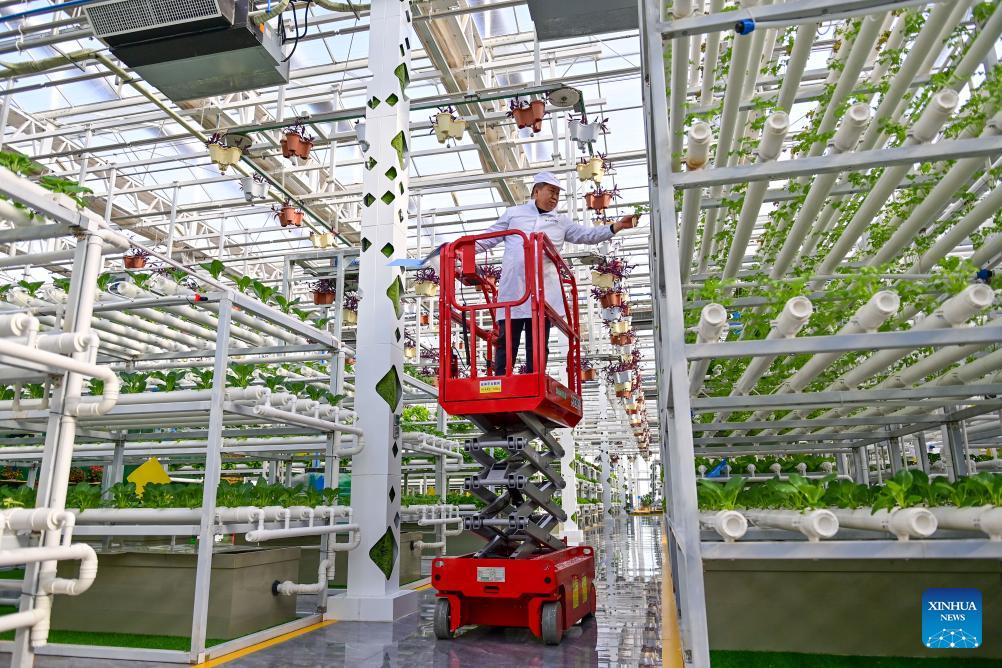 Senior agronomist Yan Ji checks the growth of vegetables at the center for future agricultural science and technology of an agricultural demonstration zone in Changji Hui Autonomous Prefecture, northwest China's Xinjiang Uygur Autonomous Region, Feb. 10, 2025. (Xinhua/Ding Lei)