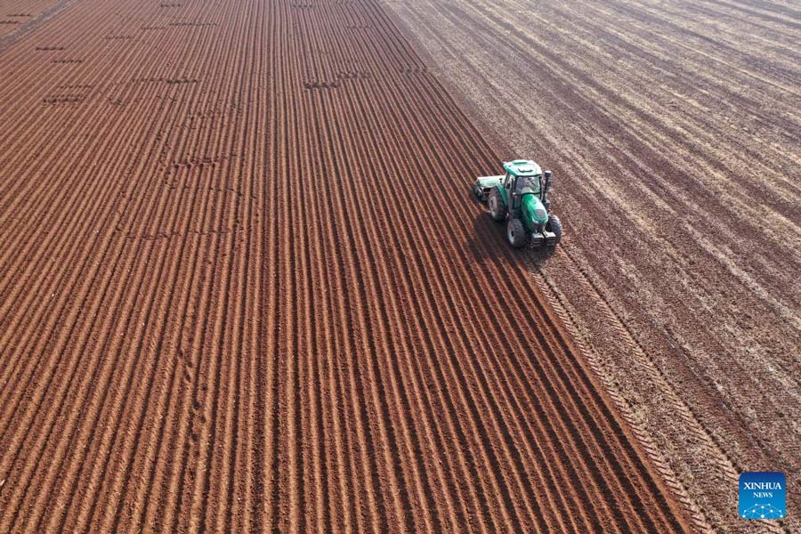 An aerial drone photo taken on Feb. 24, 2026 shows a farmer operating an agricultural machine to plough a field in Qicheng Village, Qinyang City, central China's Henan Province. After the Spring Festival holiday, farmers are busy with agricultural production in the farming season across the country. (Photo by Yang Fan/Xinhua)