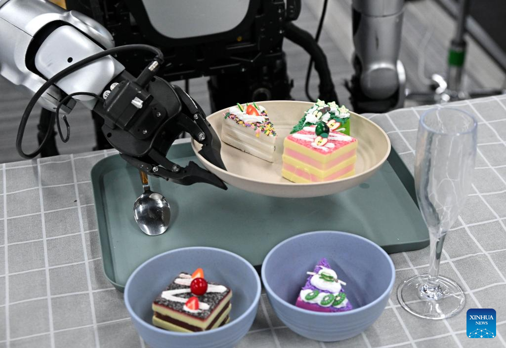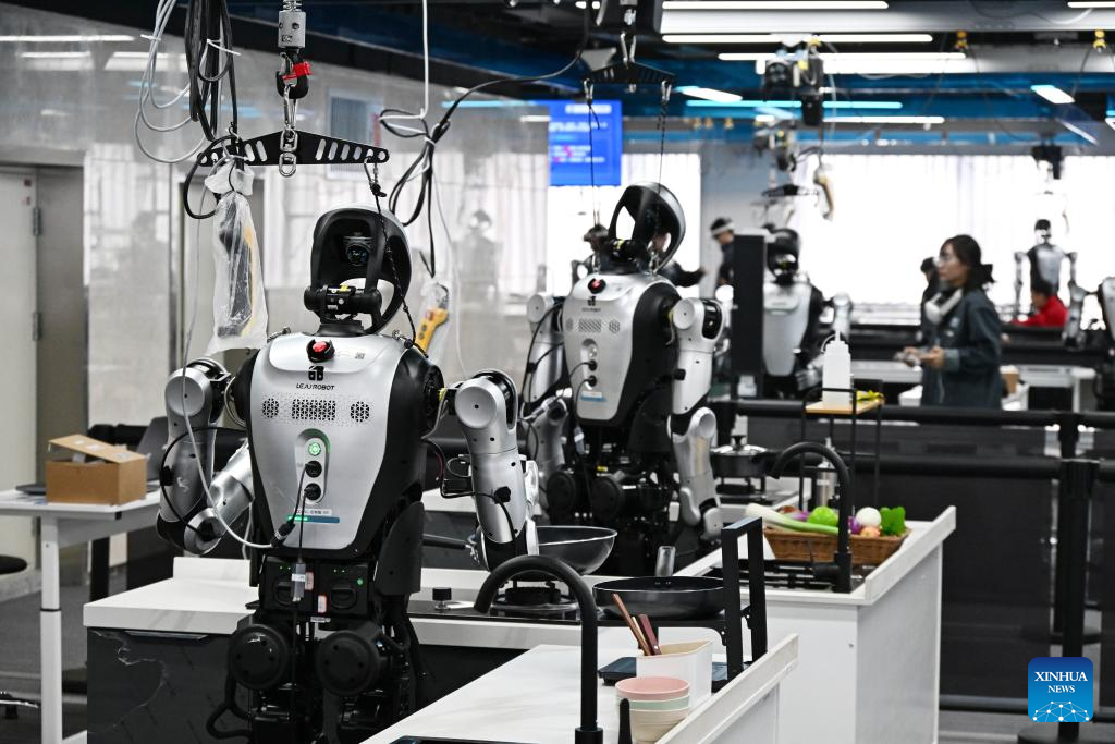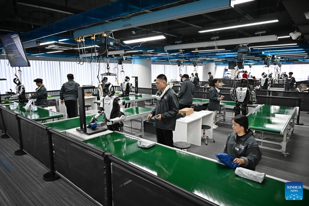 Data collectors here control robots to complete specific tasks like logistics sorting, supermarket restocking, kitchen operations, and component assembly. Through thousands of repetitions and trials, massive amounts of motion data are generated, endowing robots with a smarter "intelligent brain," and helping humanoid robots enter all walks of life to serve thousands of households. (Xinhua/Li Ziheng)