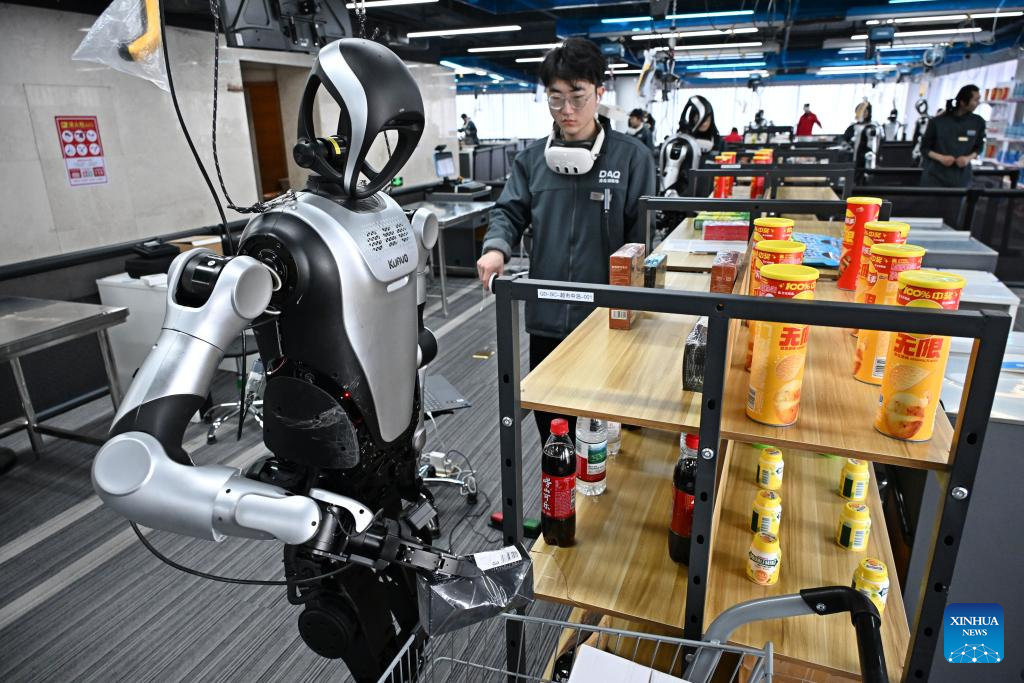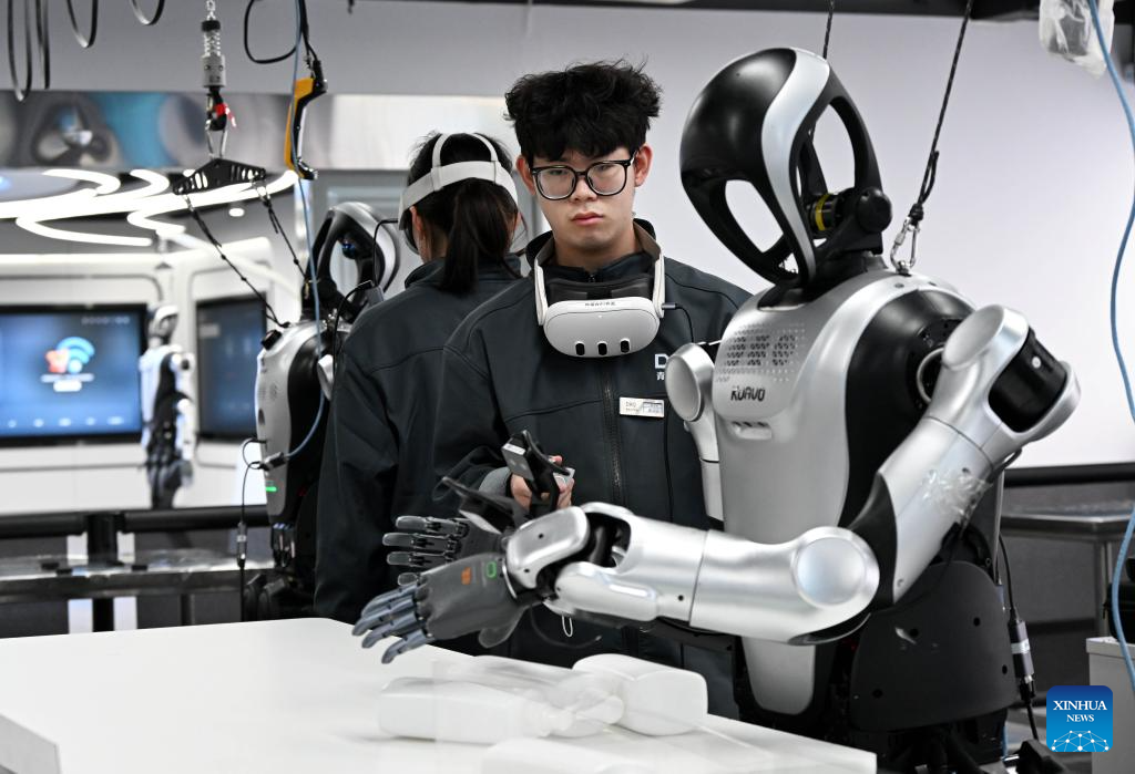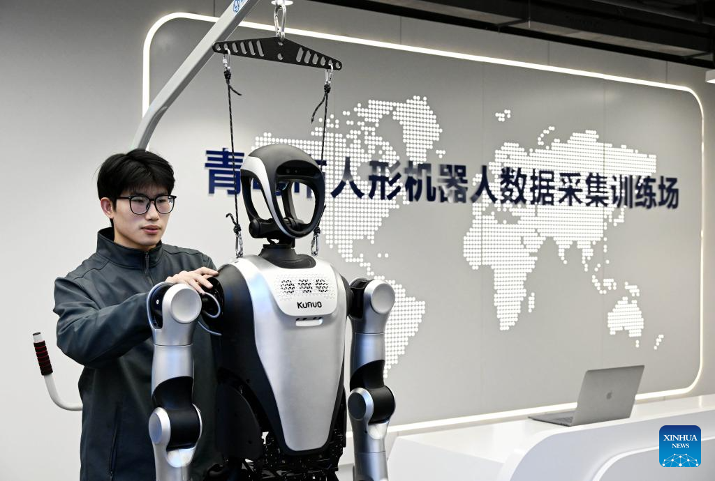 A staff member conducts training and data collection on a humanoid robot at the Qingdao Humanoid Robot Data Training Center in Laoshan District of Qingdao, east China's Shandong Province, March 23, 2026. Located in the city's Laoshan District, the Qingdao Humanoid Robot Data Training Center is equipped with data collection scenarios for humanoid robots such as intelligent industrial manufacturing, smart home, and commercial services, providing support for related research and development of humanoid robots.