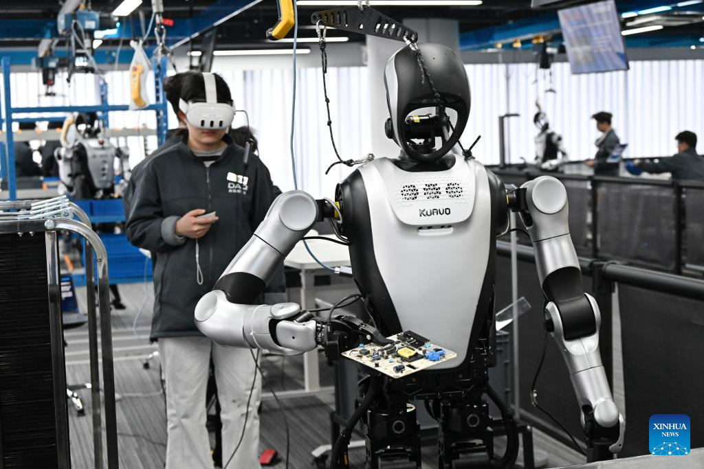 A staff member adjusts a humanoid robot at the Qingdao Humanoid Robot Data Training Center in Laoshan District of Qingdao, east China's Shandong Province, March 23, 2026. Located in the city's Laoshan District, the Qingdao Humanoid Robot Data Training Center is equipped with data collection scenarios for humanoid robots such as intelligent industrial manufacturing, smart home, and commercial services, providing support for related research and development of humanoid robots.