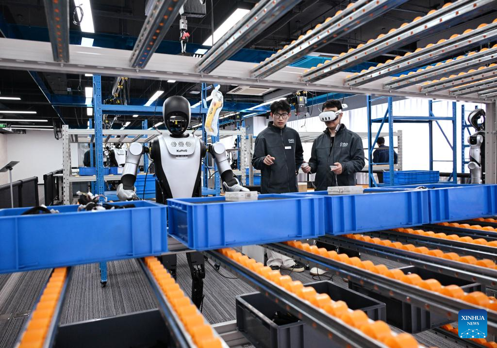 Staff members conduct training and data collection on humanoid robots at the Qingdao Humanoid Robot Data Training Center in Laoshan District of Qingdao, east China's Shandong Province, March 23, 2026. Located in the city's Laoshan District, the Qingdao Humanoid Robot Data Training Center is equipped with data collection scenarios for humanoid robots such as intelligent industrial manufacturing, smart home, and commercial services, providing support for related research and development of humanoid robots.