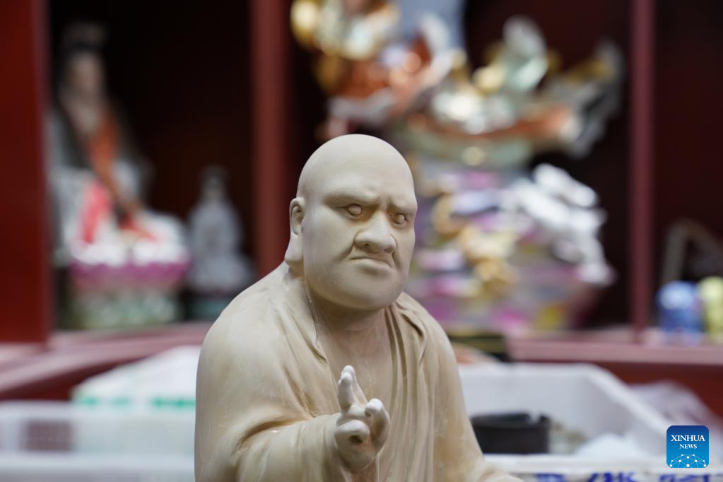 Zeng Rui works on a porcelain sculpture at his studio in Jingdezhen, east China's Jiangxi Province, March 12, 2026. A porcelain sculpture of arhat, housed in the Jingdezhen China Ceramics Museum, has gained Internet fame after netizens nicknamed it the "Speechless Buddha" for its endearingly charming expression. The artwork was created over 80 years ago by Zeng Longsheng, a master of Chinese porcelain art who established a long-standing family reputation for porcelain sculpture.