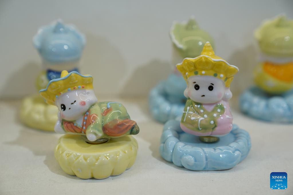 Cultural and creative products inspired by the "Speechless Buddha" are pictured at Zeng Rui's studio in Jingdezhen, east China's Jiangxi Province, March 12, 2026. (Xinhua/Zhou Mi)