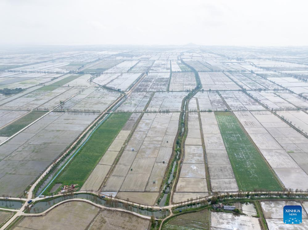 An aerial drone photo shows staff members operating rice transplanters to transplant rice seedlings in the fields in Duhu Town of Taishan, south China's Guangdong Province, March 24, 2026. In recent years, Taishan has been promoting the transformation of traditional farming into "smart grain cultivation" through technological empowerment. The mechanized transplanting rate of rice has reached 94.5 percent, while the comprehensive mechanization rate of plowing, sowing and harvesting has reached 98.35 percent. (Xinhua/Mao Siqian)