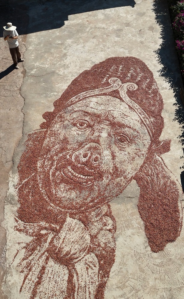 Ning Si creates a painting using red corn kernels in Xuanhe village, Zhenyuan Yi, Hani and Lahu Autonomous County, Pu'er city, southwest China's Yunnan Province. (Photo courtesy of the media convergence center of Zhenyuan Yi, Hani and Lahu Autonomous County)