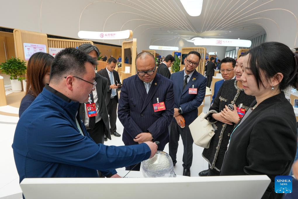 Guests learn about an intelligent brain-machine interface system at the Zhongguancun International Innovation Center in Beijing, capital of China, March 25, 2026. The 2026 Zhongguancun Forum runs from March 25 to 29 under the theme "Full Integration Between Technological and Industrial Innovation." (Xinhua/Ju Huanzong)
