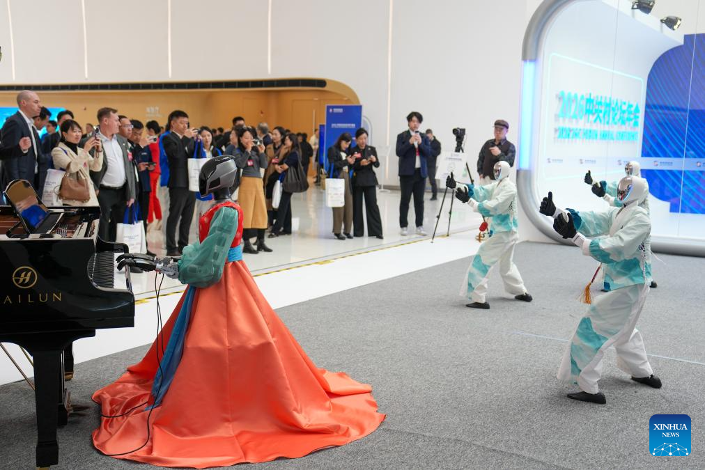 Humanoid robots play the musical instruments and dance at the Zhongguancun International Innovation Center in Beijing, capital of China, March 25, 2026. The 2026 Zhongguancun Forum runs from March 25 to 29 under the theme "Full Integration Between Technological and Industrial Innovation." (Xinhua/Ju Huanzong)