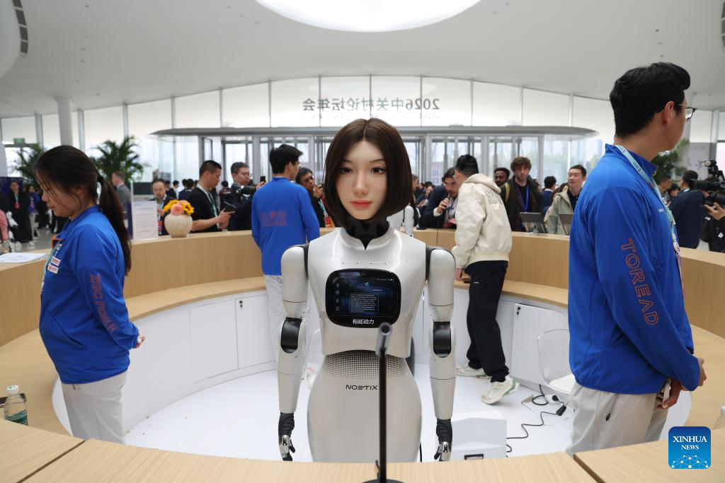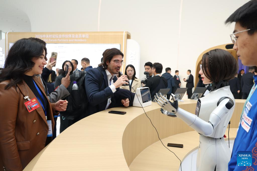 Guests interact with a humanoid robot at the Zhongguancun International Innovation Center in Beijing, capital of China, March 25, 2026. The 2026 Zhongguancun Forum runs from March 25 to 29 under the theme "Full Integration Between Technological and Industrial Innovation." (Xinhua/Jin Liwang)