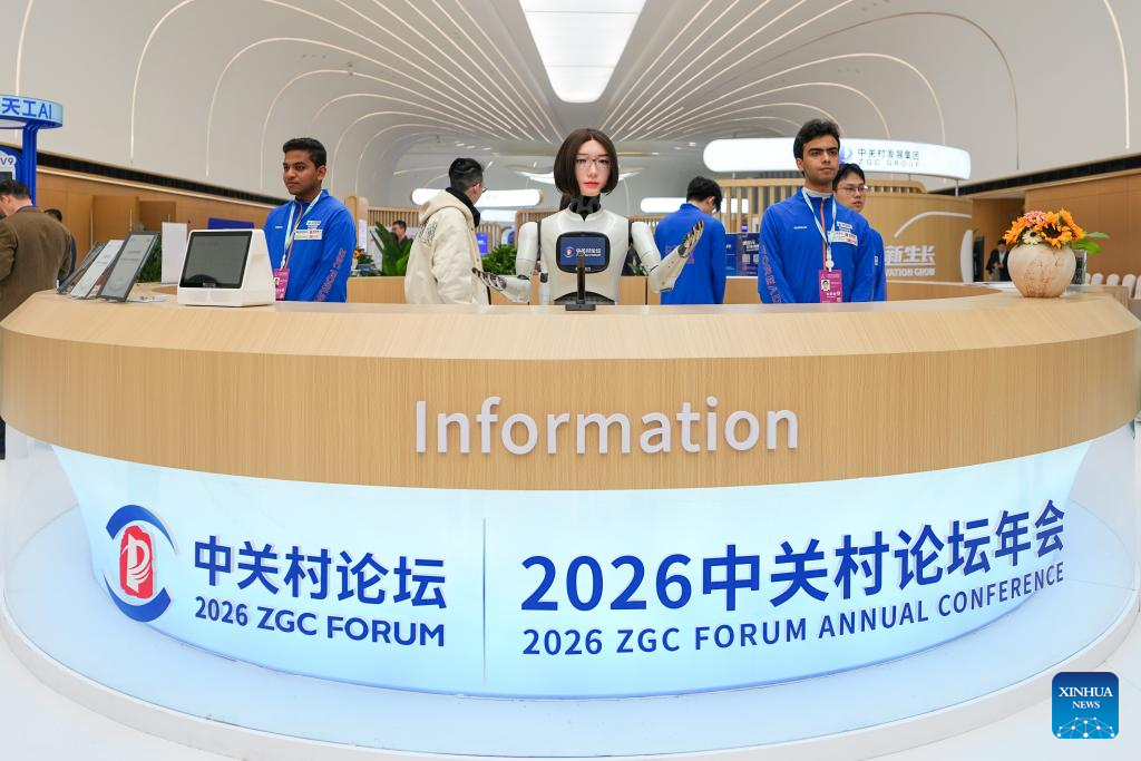 A humanoid robot greets guests at the Zhongguancun International Innovation Center in Beijing, capital of China, March 25, 2026. The 2026 Zhongguancun Forum runs from March 25 to 29 under the theme "Full Integration Between Technological and Industrial Innovation." (Xinhua/Ju Huanzong)