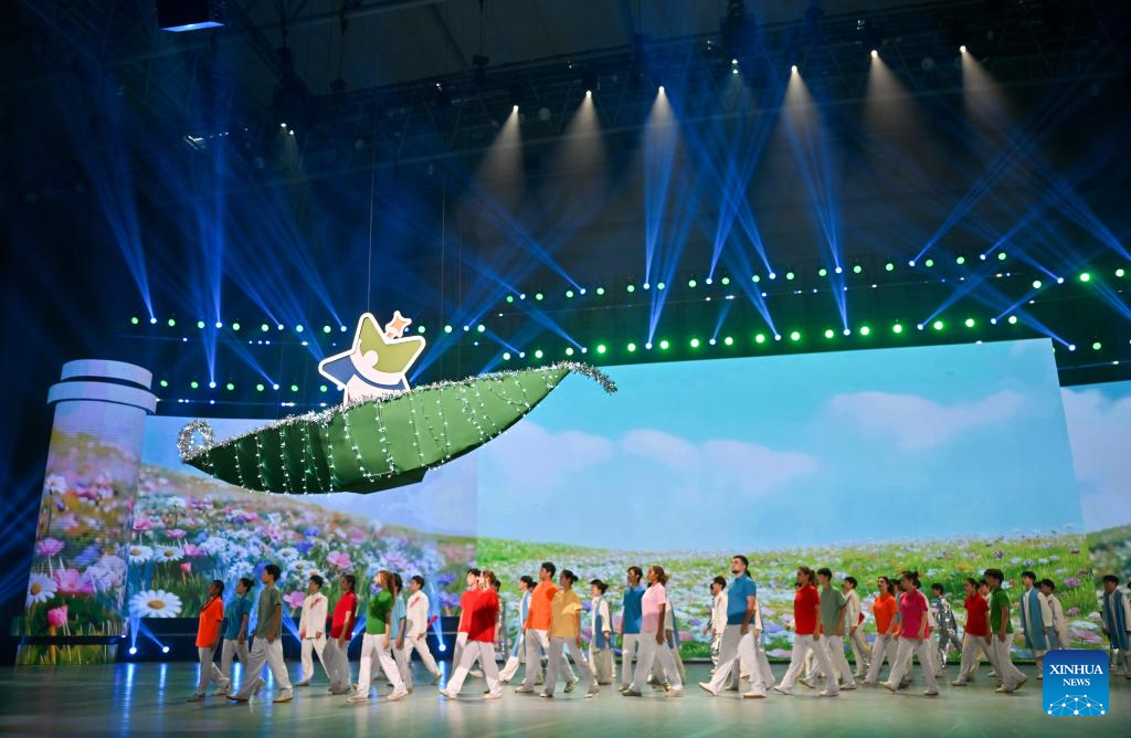 Artists perform during the opening ceremony of the 10th World Junior Wushu Championships in Tianjin, north China, March 25, 2026. (Xinhua/Sun Fanyue)