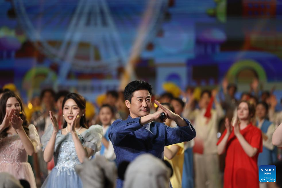 International Wushu Federation Ambassador Wu Jing (C) is seen during the opening ceremony of the 10th World Junior Wushu Championships in Tianjin, north China, March 25, 2026. (Xinhua/Sun Fanyue)