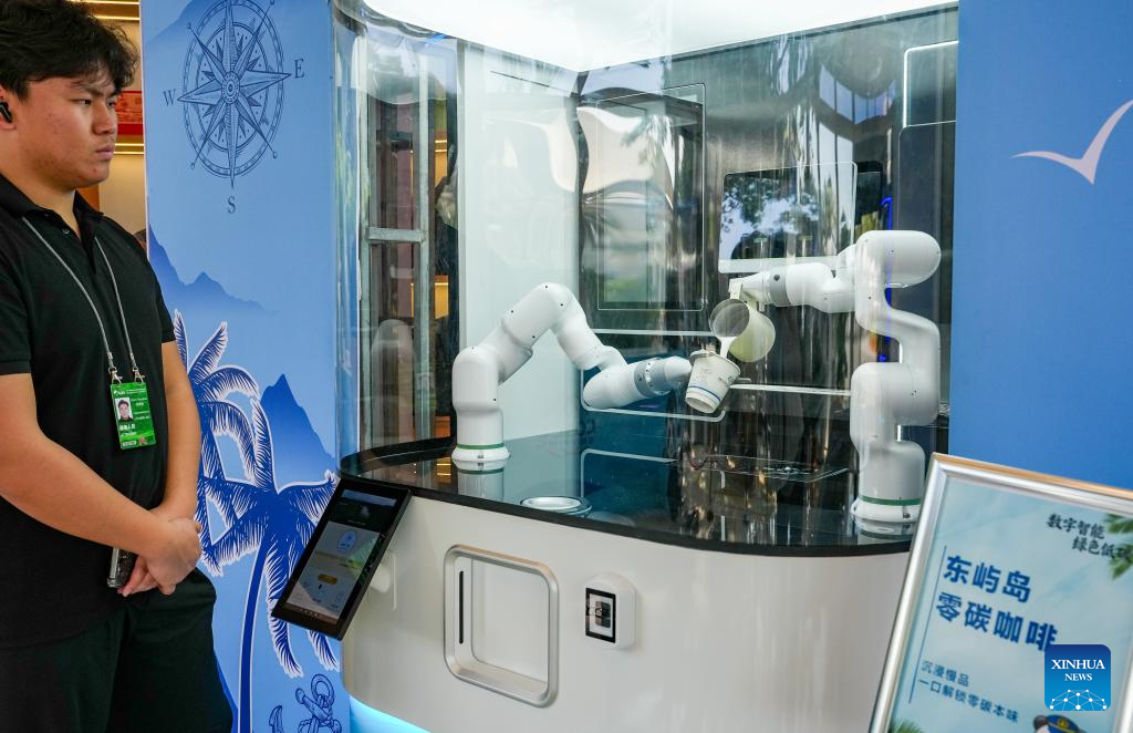 A robotic arm makes coffee for guests at Dongyu Island of Boao Town, Qionghai City of south China's Hainan Province, March 24, 2026.