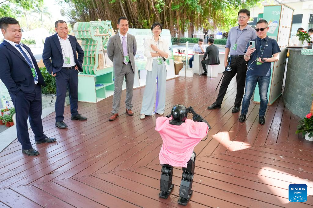 A humanoid robot greets guests at the Hainan Free Trade Port High-Standard development Exhibition at Dongyu Island of Boao Town, Qionghai City of south China's Hainan Province, March 24, 2026.