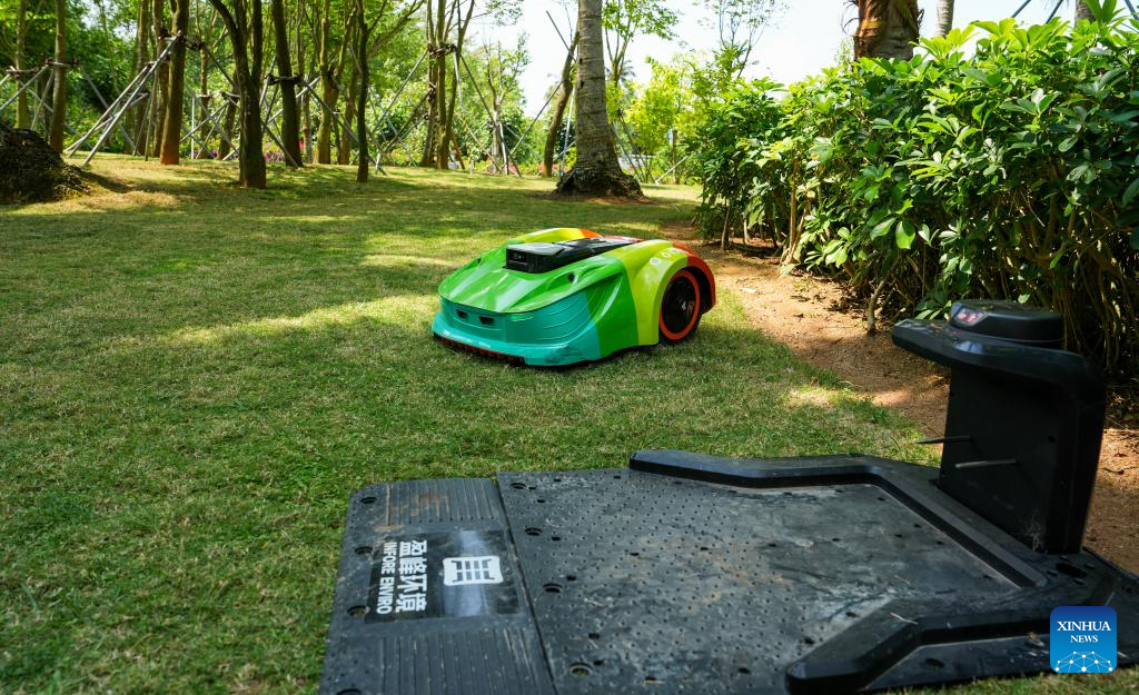 An intelligent unmanned lawnmower works on the lawn around the China (Hainan) Museum of the South China Sea in south China's Hainan Province, March 25, 2026.