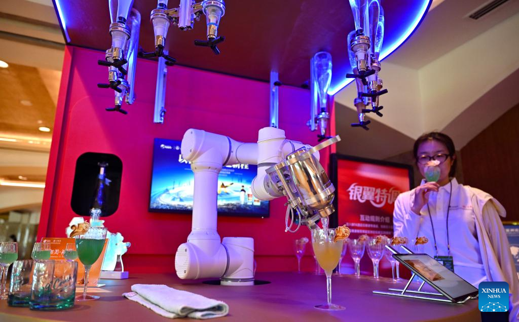 An automated bartending robot mixes drinks at the Boao Forum for Asia hotel at the Dongyu Island of Boao Town, Qionghai City of south China's Hainan Province, March 25, 2026.