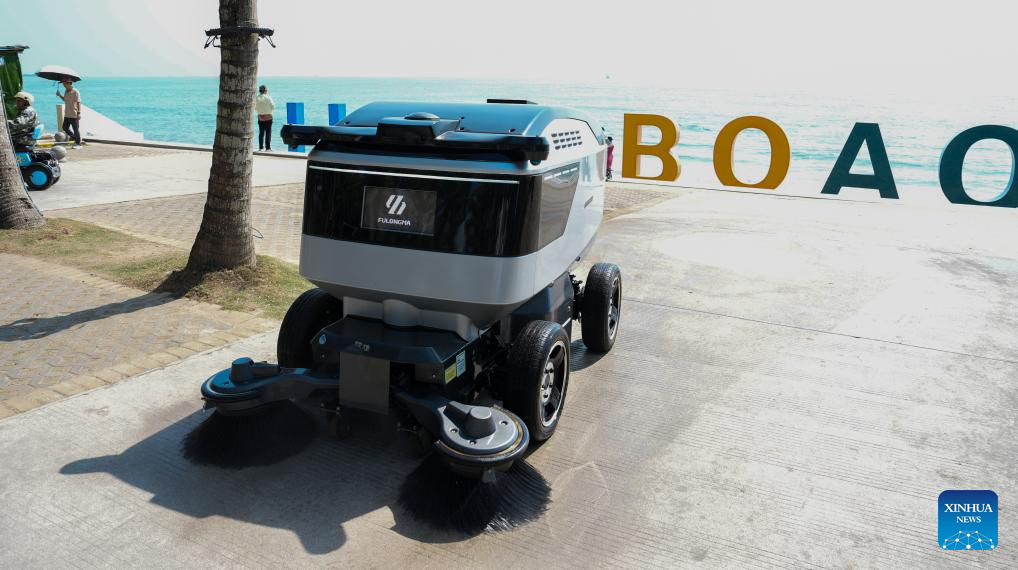 An intelligent cleaning robot works in Boao Town, Qionghai City, south China's Hainan Province, March 25, 2026. Smart sanitation facilities are in service during the Boao Forum for Asia (BFA) Annual Conference 2026, becoming a highlight of urban services with accurate dispatch, rapid disposal and high standards. (Xinhua/Liu Lianfen)