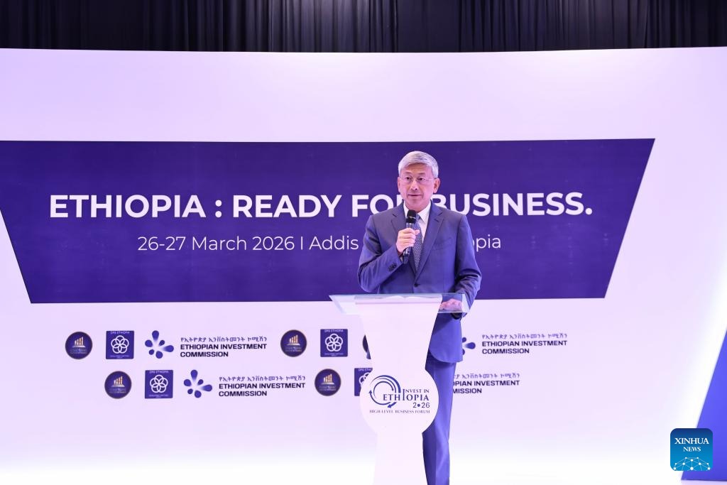 Chinese Ambassador to Ethiopia Chen Hai addresses the closing session of "Invest in Ethiopia" High-Level Business Forum in Addis Ababa, Ethiopia, March 27, 2026. Ethiopia's flagship investment forum, dubbed "Invest in Ethiopia," concluded on Friday with the signing of investment agreements worth over 13 billion U.S. dollars. The fourth edition of the forum was held under the theme "Ethiopia: Ready for Business" in Addis Ababa, the country's capital, attracting hundreds of investors, business leaders, and advisors from across the globe, according to the organizers. (Xinhua/Geng Xinning)