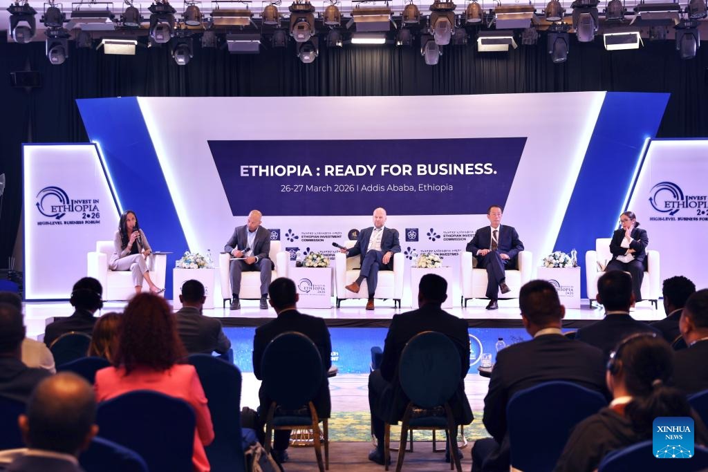 Guests attend a discussion during "Invest in Ethiopia" High-Level Business Forum in Addis Ababa, Ethiopia, March 27, 2026. Ethiopia's flagship investment forum, dubbed "Invest in Ethiopia," concluded on Friday with the signing of investment agreements worth over 13 billion U.S. dollars. The fourth edition of the forum was held under the theme "Ethiopia: Ready for Business" in Addis Ababa, the country's capital, attracting hundreds of investors, business leaders, and advisors from across the globe, according to the organizers. (Xinhua/Geng Xinning)