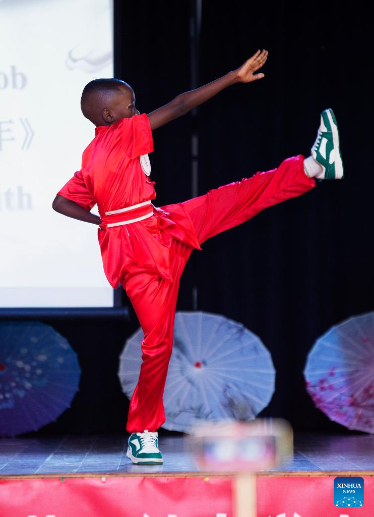Jaden Jacob from the Motswedi Community Junior Secondary School performs Chinese Gongfu during his talent show at the final of the "Chinese Bridge" Chinese Proficiency Competition for Botswanan secondary school students in Gaborone, Botswana, March 27, 2026. The final of the "Chinese Bridge" Chinese Proficiency Competition for Botswanan secondary school students was held Friday in Gaborone, the southern African country's capital. (Photo by Tshekiso Tebalo/Xinhua)