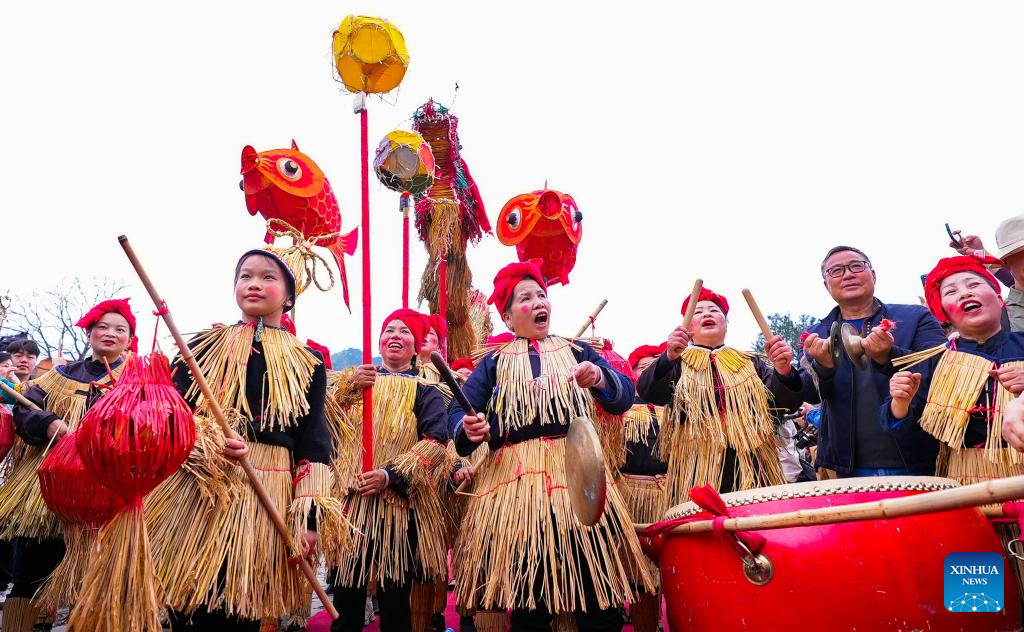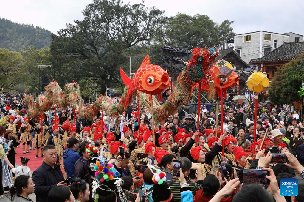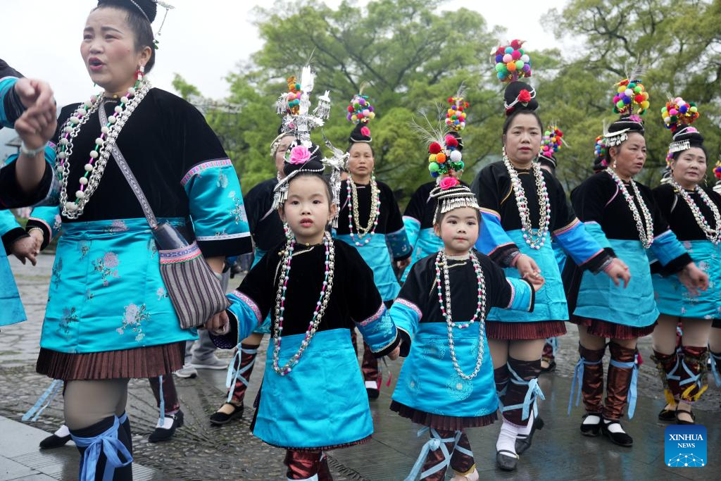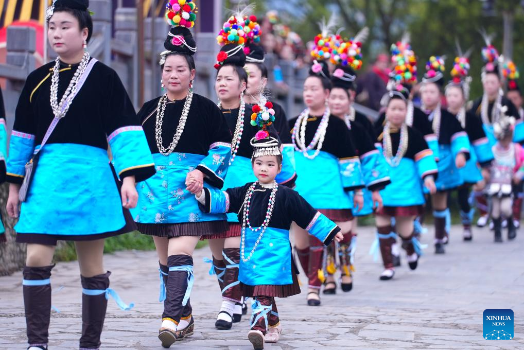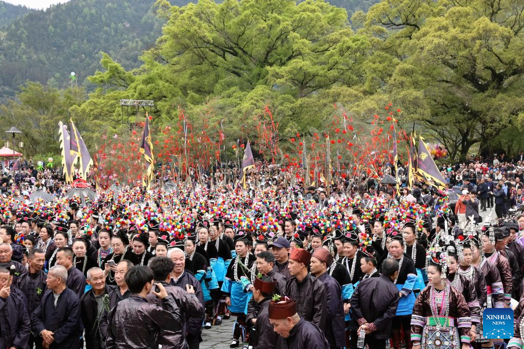 Local people attend the Sama Festival celebration event in Sanbao Dong Village in Rongjiang County, southwest China's Guizhou Province, March 28, 2026. Sama was the name of a heroine in ancient maternal society of Dong people. The Sama Festival, enlisted as one of the national intangible cultural heritages in 2006, is held to commemorate their ancestor. (Photo by Li Changhua/Xinhua)