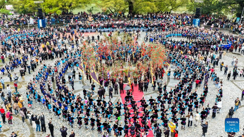 An aerial drone photo shows local people attending the Sama Festival celebration event in Sanbao Dong Village in Rongjiang County, southwest China's Guizhou Province, March 28, 2026. Sama was the name of a heroine in ancient maternal society of Dong people. The Sama Festival, enlisted as one of the national intangible cultural heritages in 2006, is held to commemorate their ancestor. (Photo by Yang Wenshu/Xinhua)