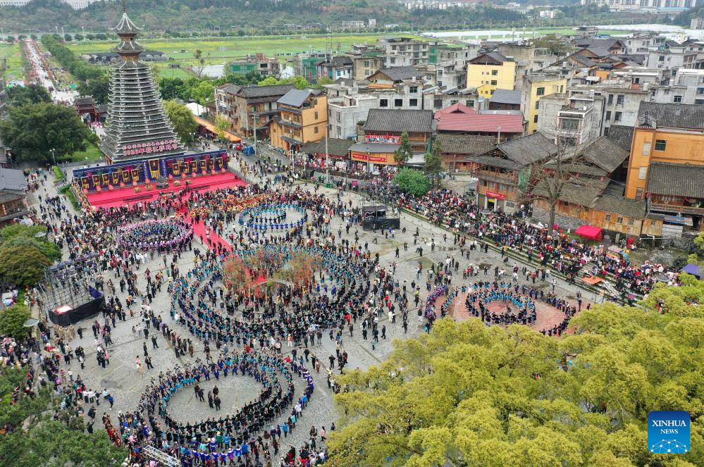 A drone photo shows local people attending the Sama Festival celebration event in Sanbao Dong Village in Rongjiang County, southwest China's Guizhou Province, March 28, 2026. Sama was the name of a heroine in ancient maternal society of Dong people. The Sama Festival, enlisted as one of the national intangible cultural heritages in 2006, is held to commemorate their ancestor. (Photo by Wei Guijin/Xinhua)