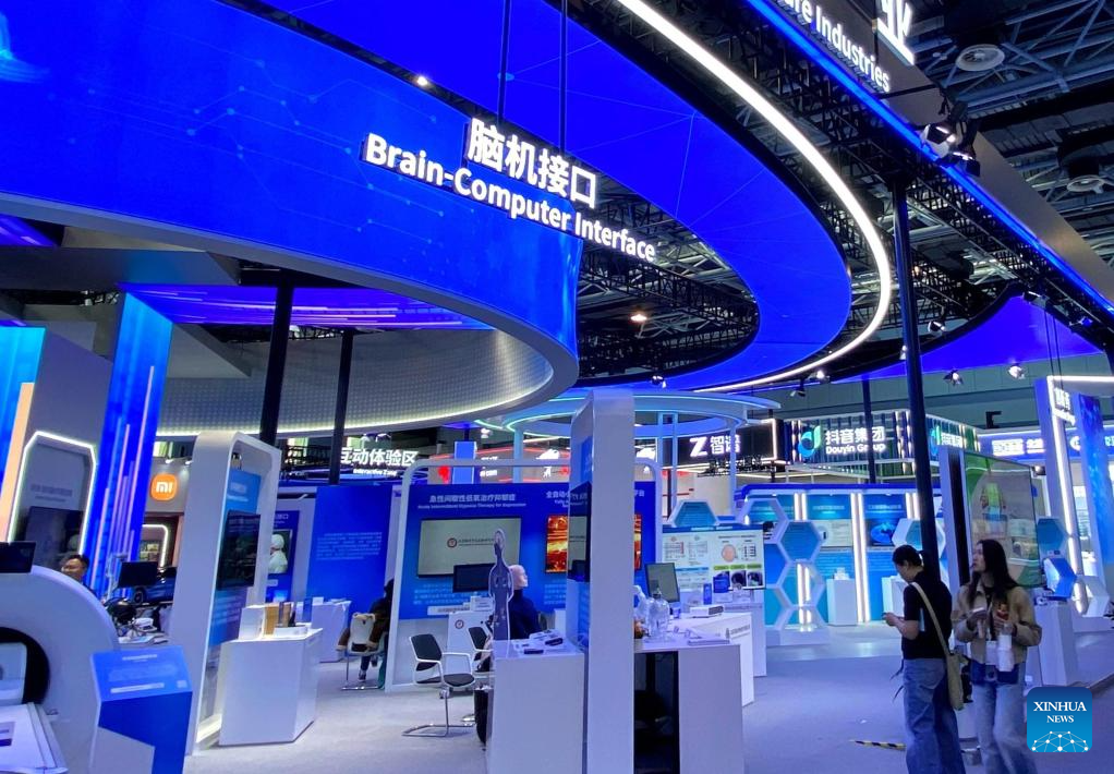 Visitors walk past the booth of brain-computer interface at an exhibition held during the 2026 Zhongguancun Forum (ZGC Forum) in Beijing, capital of China, March 27, 2026. (Xinhua/Wei Mengjia)