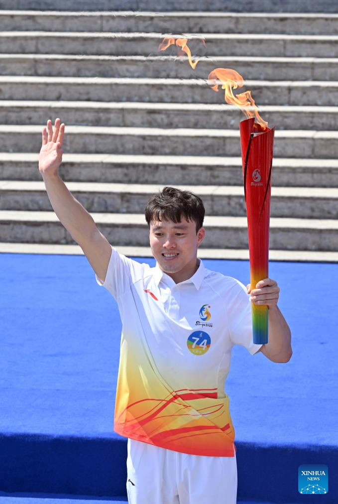 Chinese freestyle aerials skier Qi Guangpu runs holding the torch during the torch relay for the 6th Asian Beach Games Sanya 2026 in Sanya, south China's Hainan Province, March 30, 2026. (Xinhua/Guo Cheng)