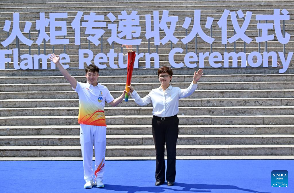 Chinese freestyle aerials skier Qi Guangpu (L) holds the torch during the flame return ceremony of torch relay for the 6th Asian Beach Games Sanya 2026 in Sanya, south China's Hainan Province, March 30, 2026. (Xinhua/Guo Cheng)