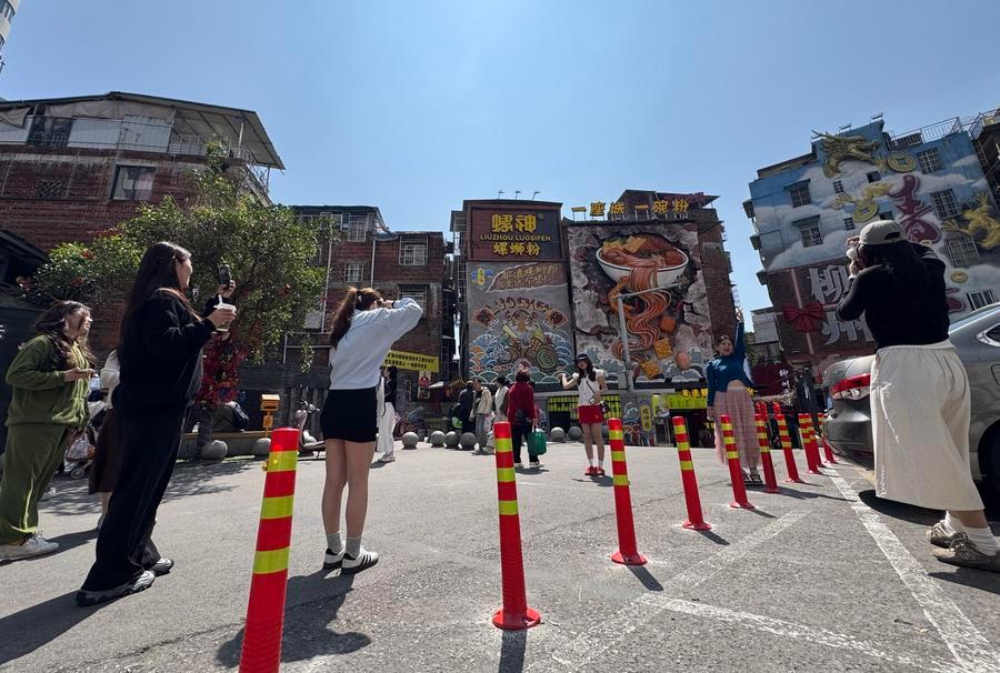 Tourists pose for photos in front of a Luosifen cultural wall in Liuzhou City, south China's Guangxi Zhuang Autonomous Region, March 11, 2026. (Photo by Zheng Changhao/Xinhua)