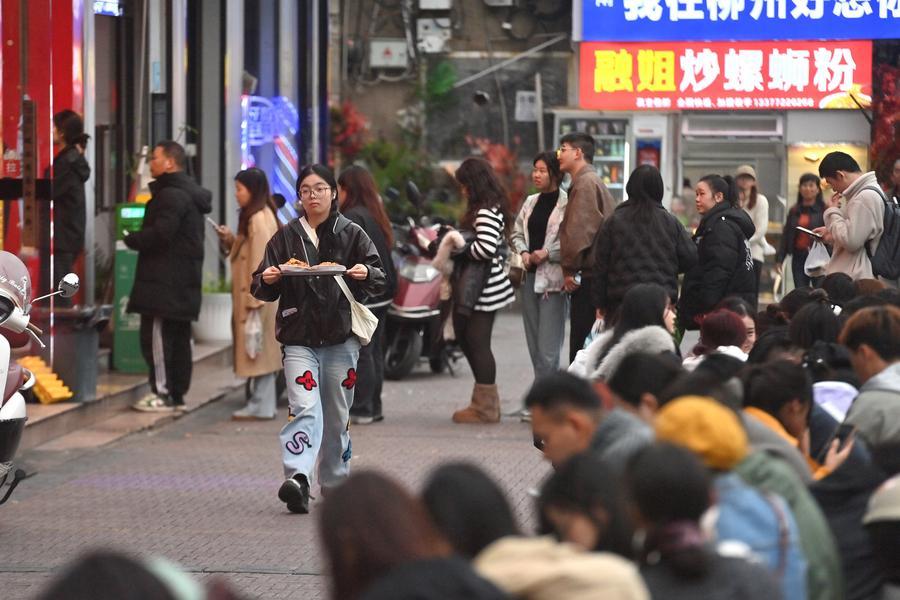 People queue up to buy stir-fried Luosifen from a shop in Liuzhou City, south China's Guangxi Zhuang Autonomous Region, March 10, 2026. (Xinhua/Huang Xiaobang)