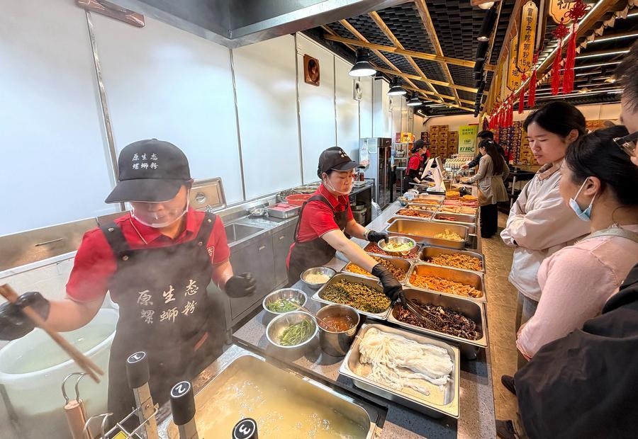 Staff members prepare Luosifen for customers at a shop in Liuzhou City, south China's Guangxi Zhuang Autonomous Region, March 28, 2026. (Photo by Zheng Changhao/Xinhua)
