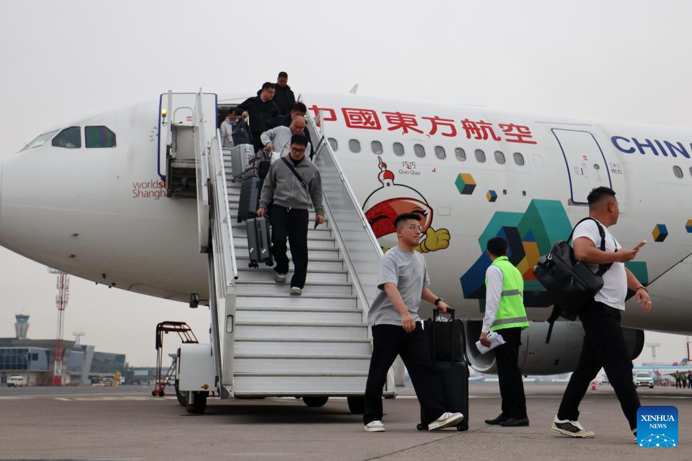 Passengers disembark from the inaugural flight of China Eastern Airlines from Shanghai to Tashkent in Tashkent, Uzbekistan, March 30, 2026. A new direct passenger air route connecting the eastern Chinese city of Shanghai and the Uzbek capital of Tashkent was launched Monday.