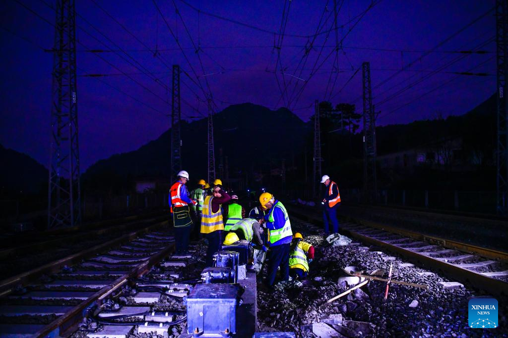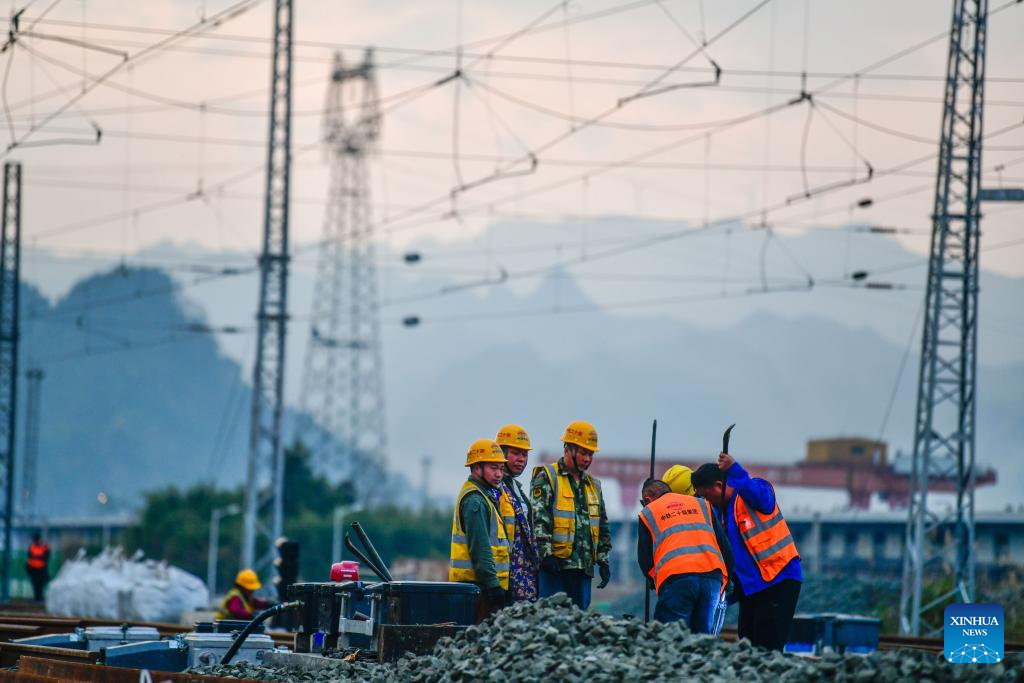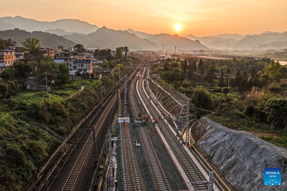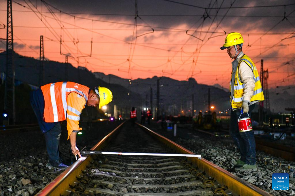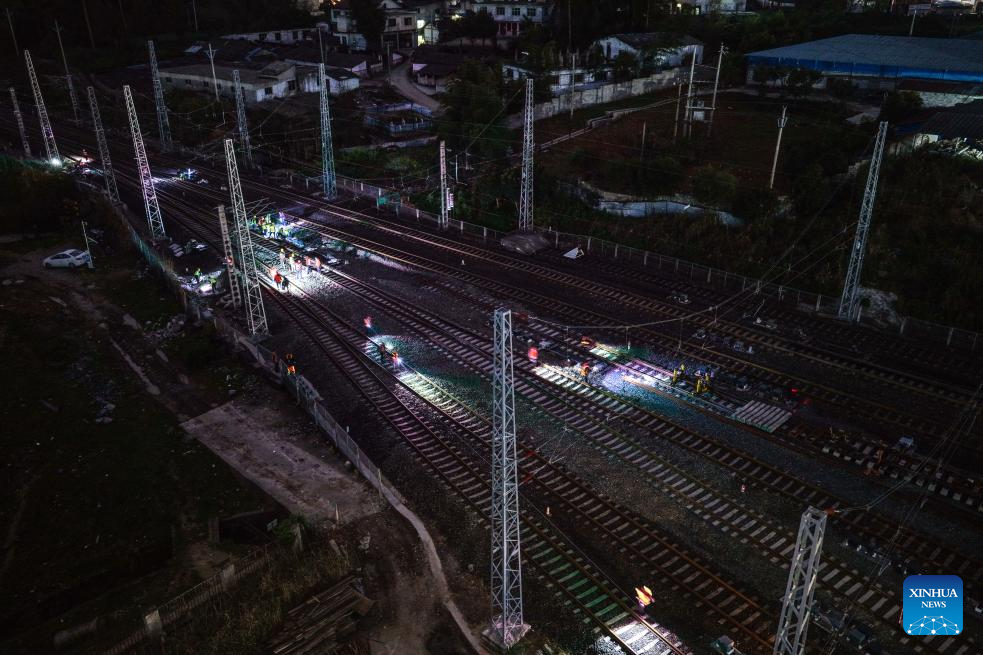 Upgrade of Lyuyinhu station was completed on Monday, laying a solid foundation for the full operation of the south-to-north extension line of Weng'an-Machangping Railway. The 148-kilometer-long extension line is a key project in the rail freight transport in Guizhou Province. (Xinhua/Yang Wenbin)