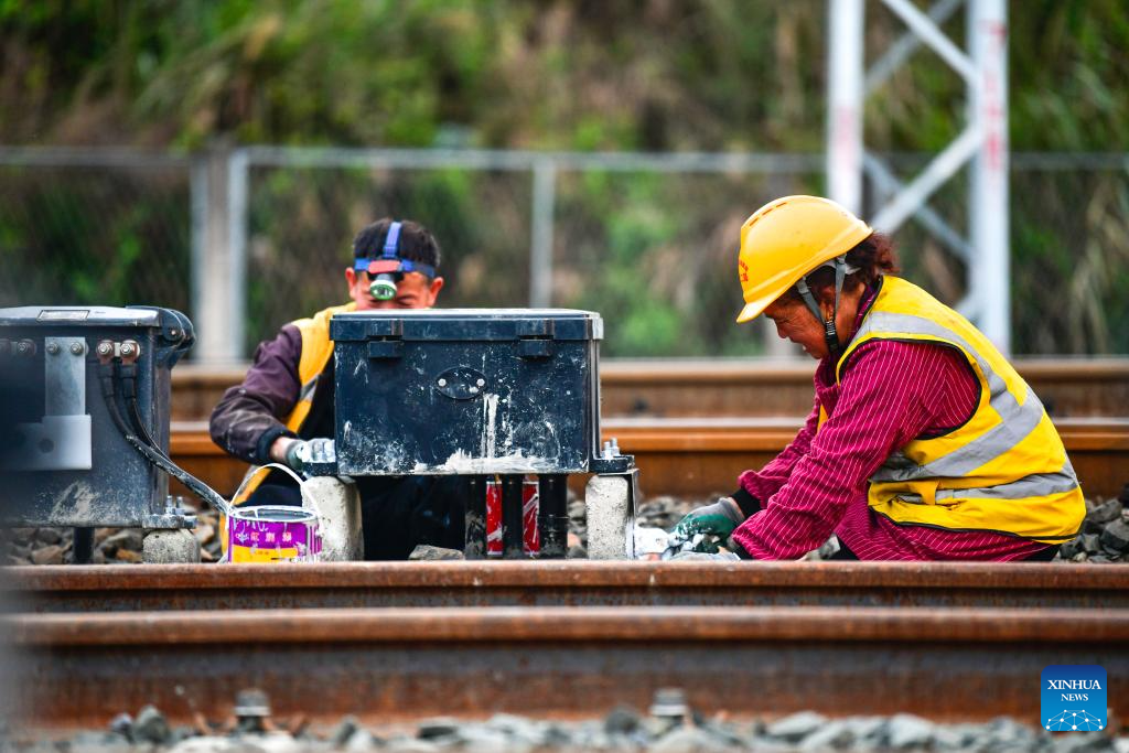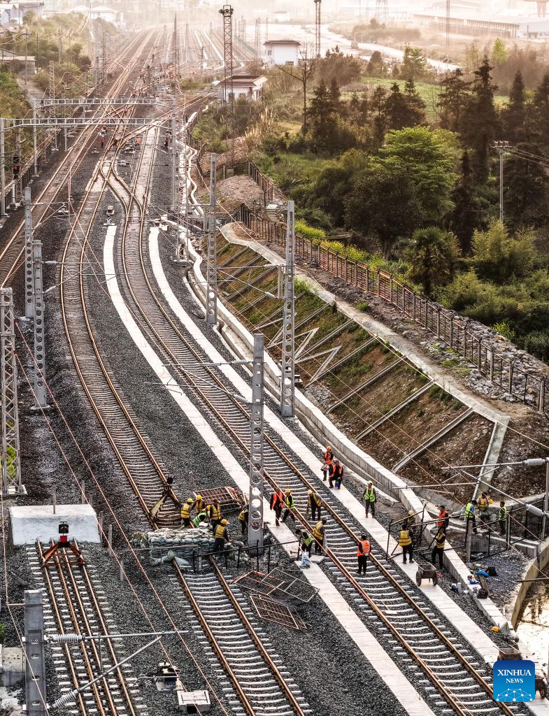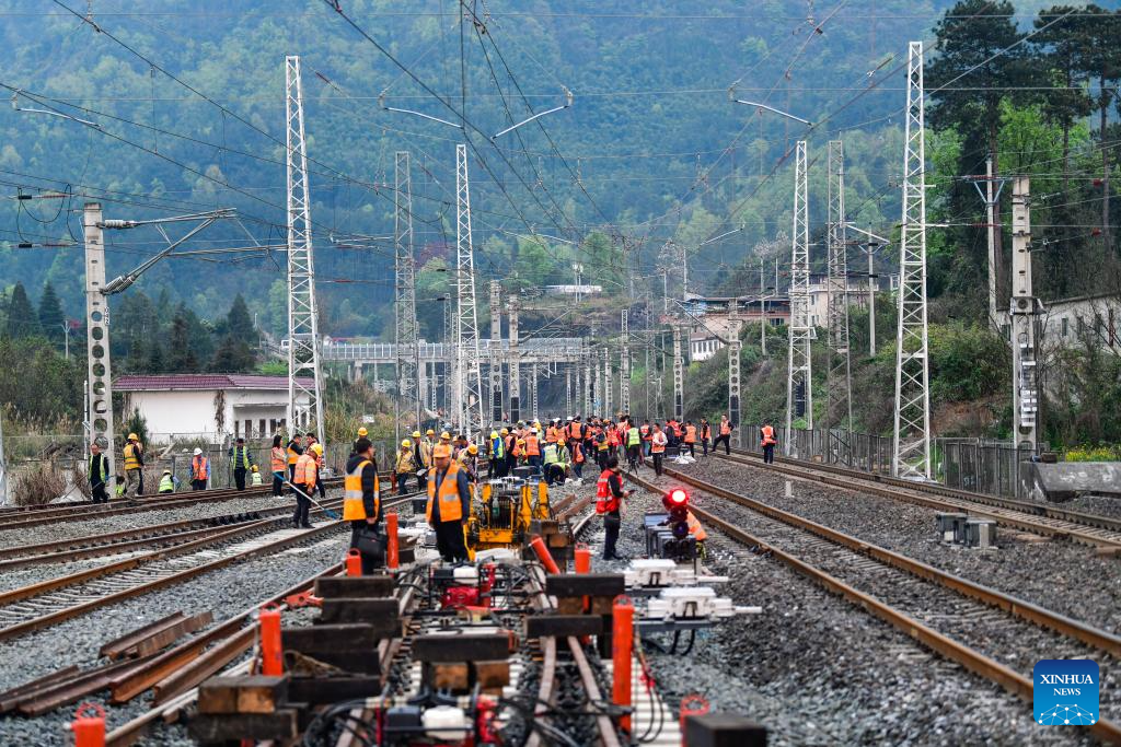 Railway workers are busy at the upgrade project of Lyuyinhu station along the south-to-north extension line of Weng'an-Machangping Railway in southwest China's Guizhou Province, March 30, 2026.
